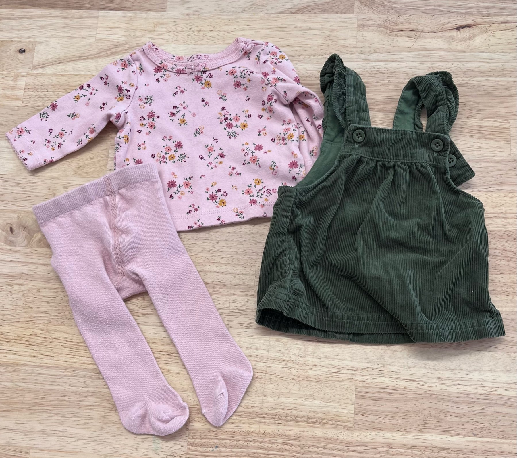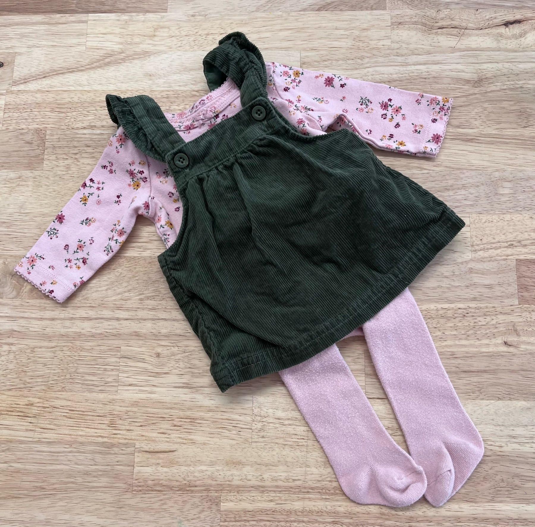 Forest green corduroy dress, pink floral shirt, and matching tights, minimal wear.