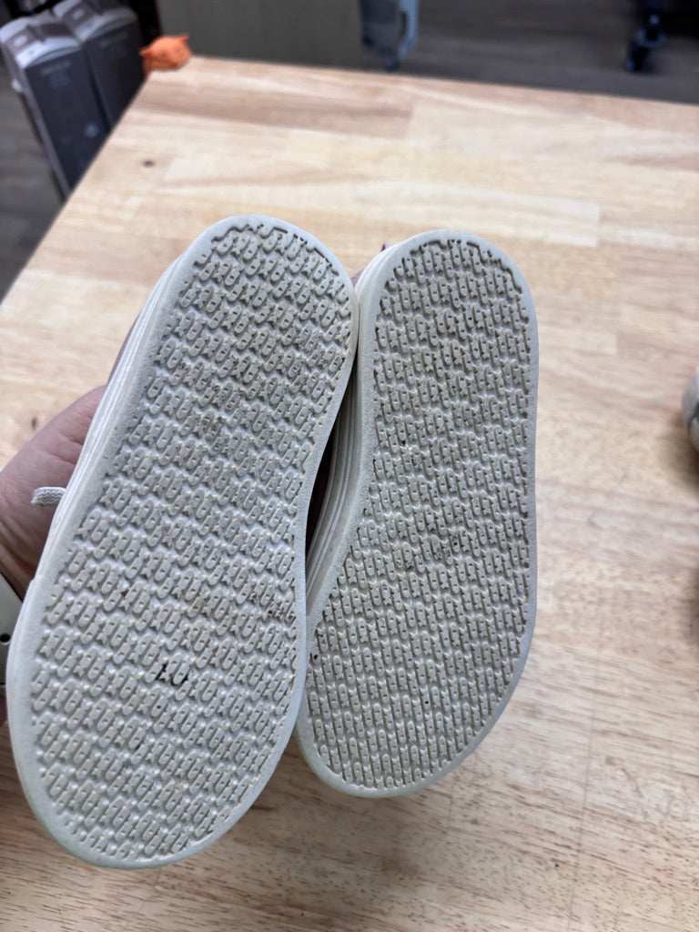 Light pink sneaker with elastic laces; laces fraying but minimal overall wear.
