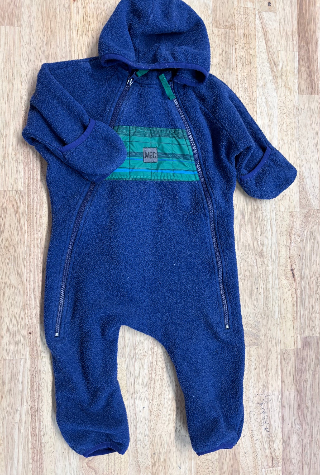 Navy and forest green fleece bunting suit. Well loved with visible wear; still cozy and functional. Fair used condition.