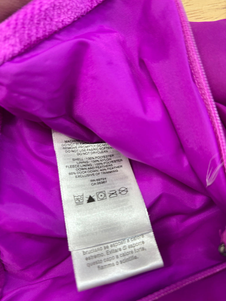 Fuchsia snow bunting suit with fleece lining and down fill. Warm and cozy. Good used condition with light wear.