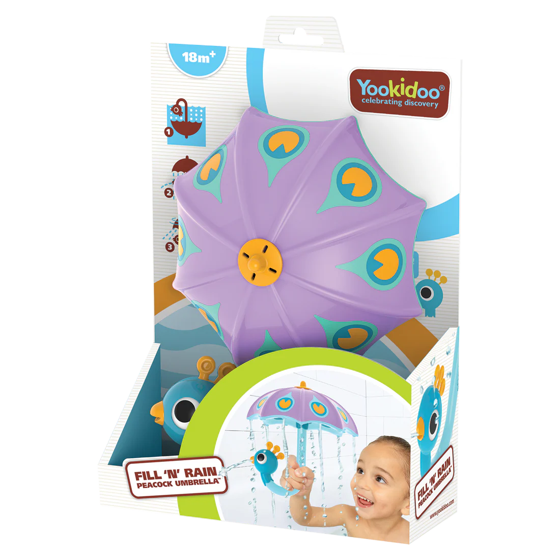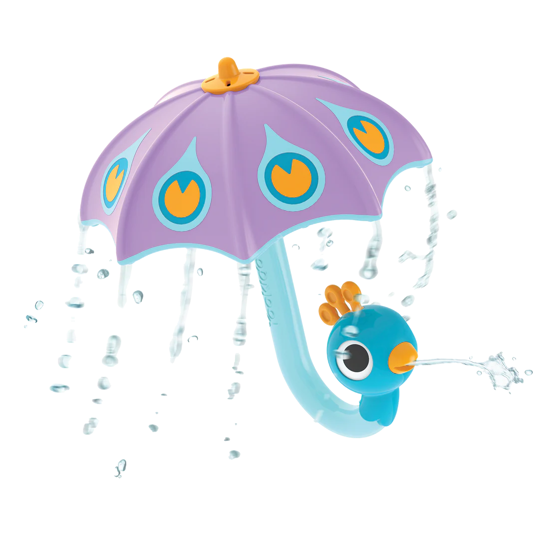 Submerge the peacock umbrella upside-down, letting it fill with water as bubbles come out. Raise the umbrella and turn it upright, then watch as water sprinkles from the peacock's mouth and the umbrella gently pours rain. The peacock umbrella encourages pretend play, and teaches cause-and-effect and concepts like 'full' and 'empty'.