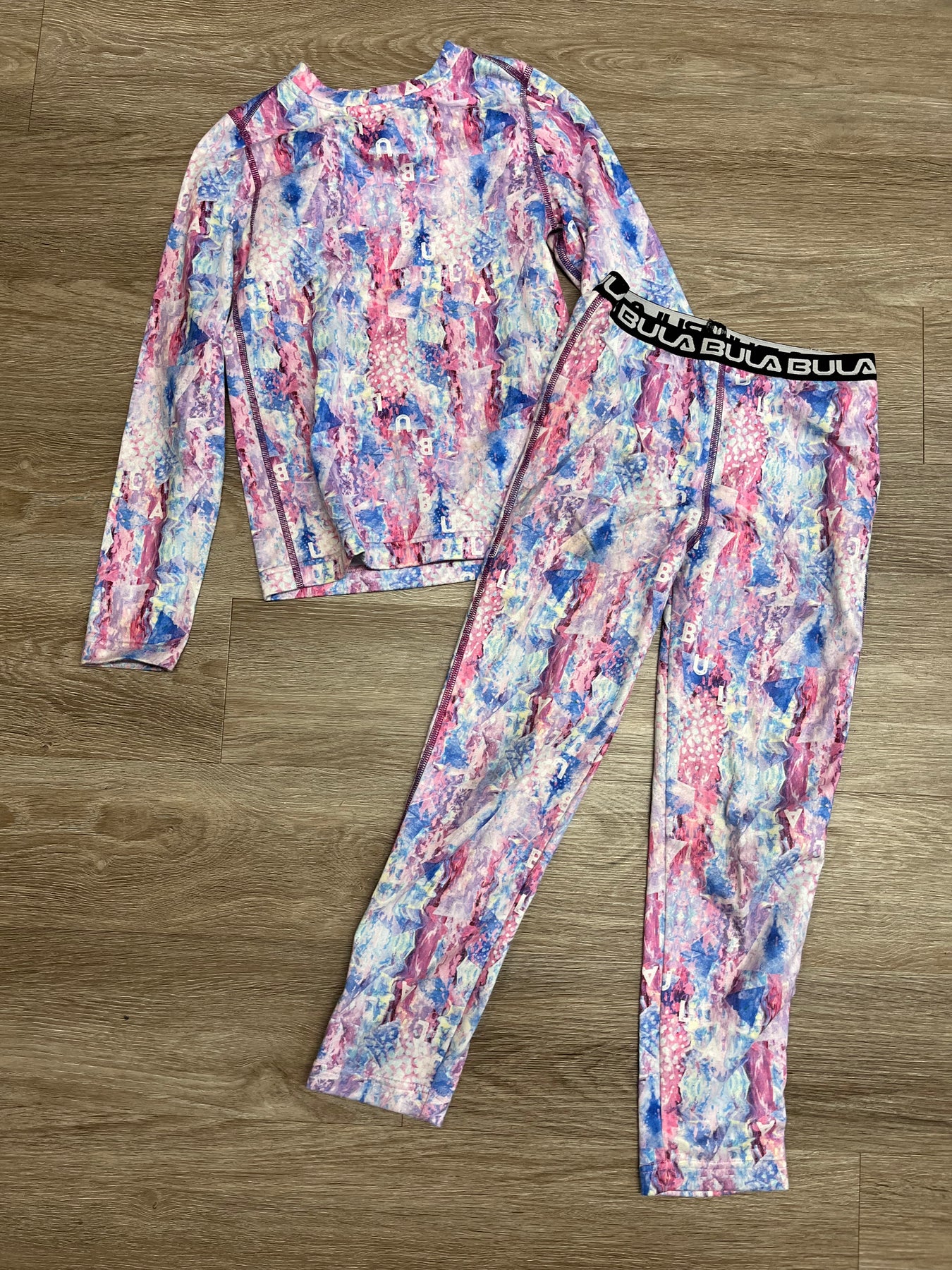 Polyester base layers in pink/blue/green tie-dye print; matching top and pants; good used condition.