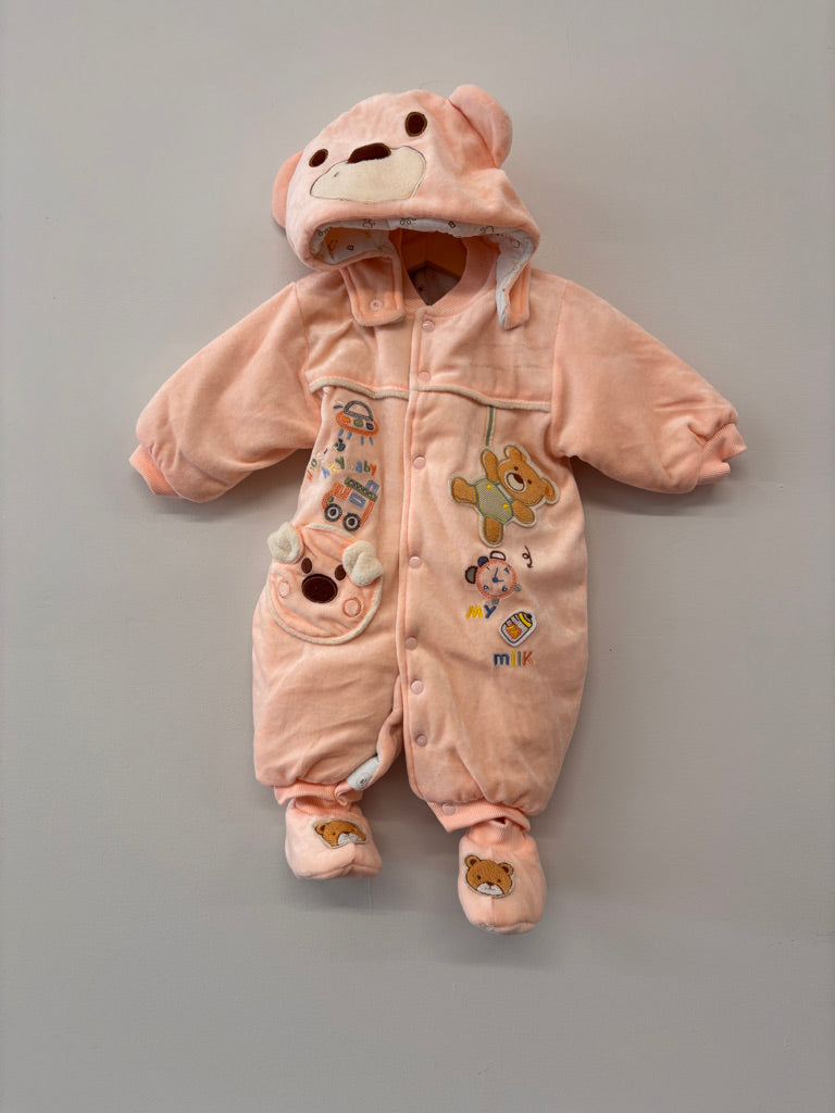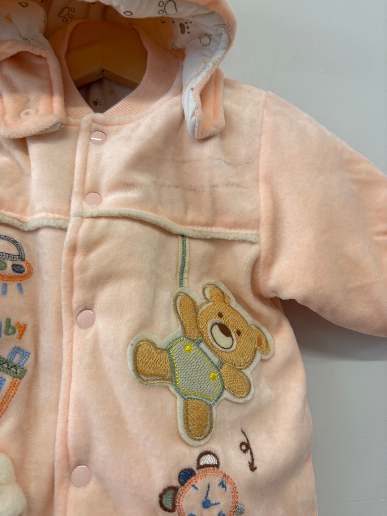 San Fran snap-up bunting bag in peach with decorative front. Light wear and small stains noted, otherwise good condition.