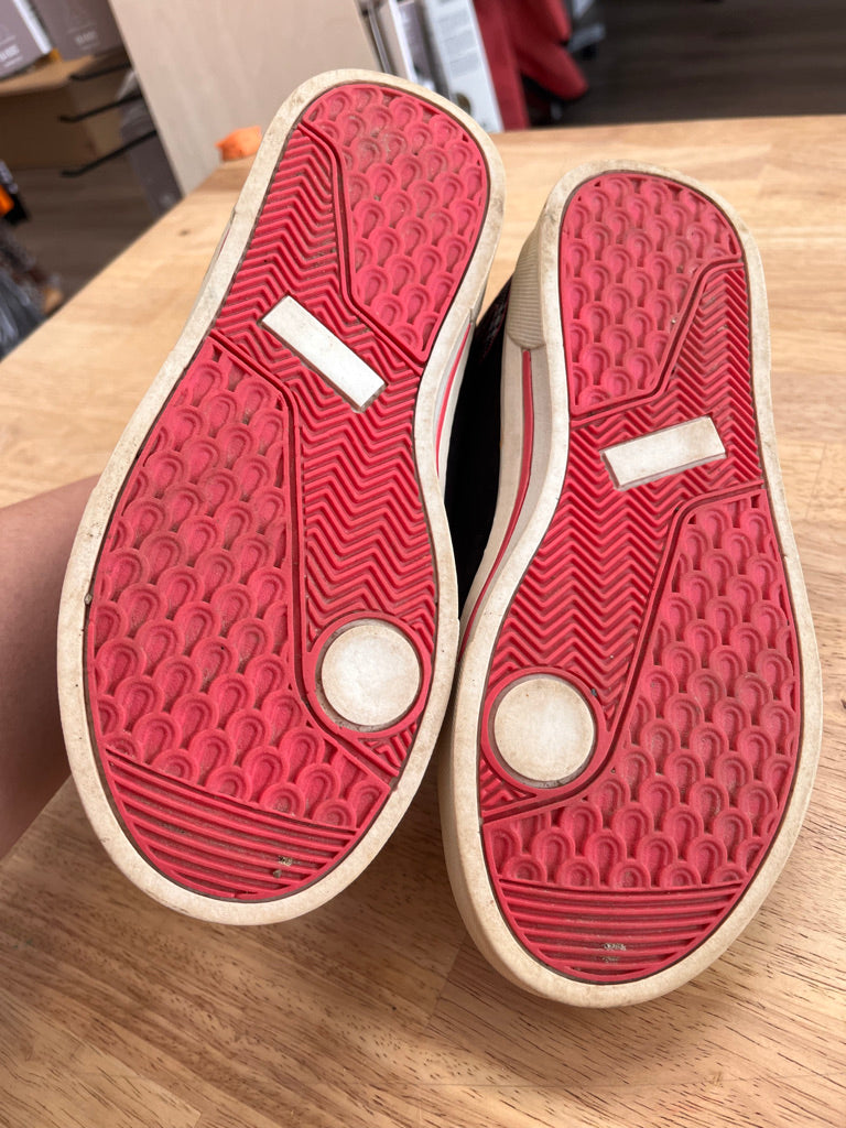 Skateshop youth size 5 sneakers in black with neon orange laces. Light scuffs, yellowing on sole; good used condition.