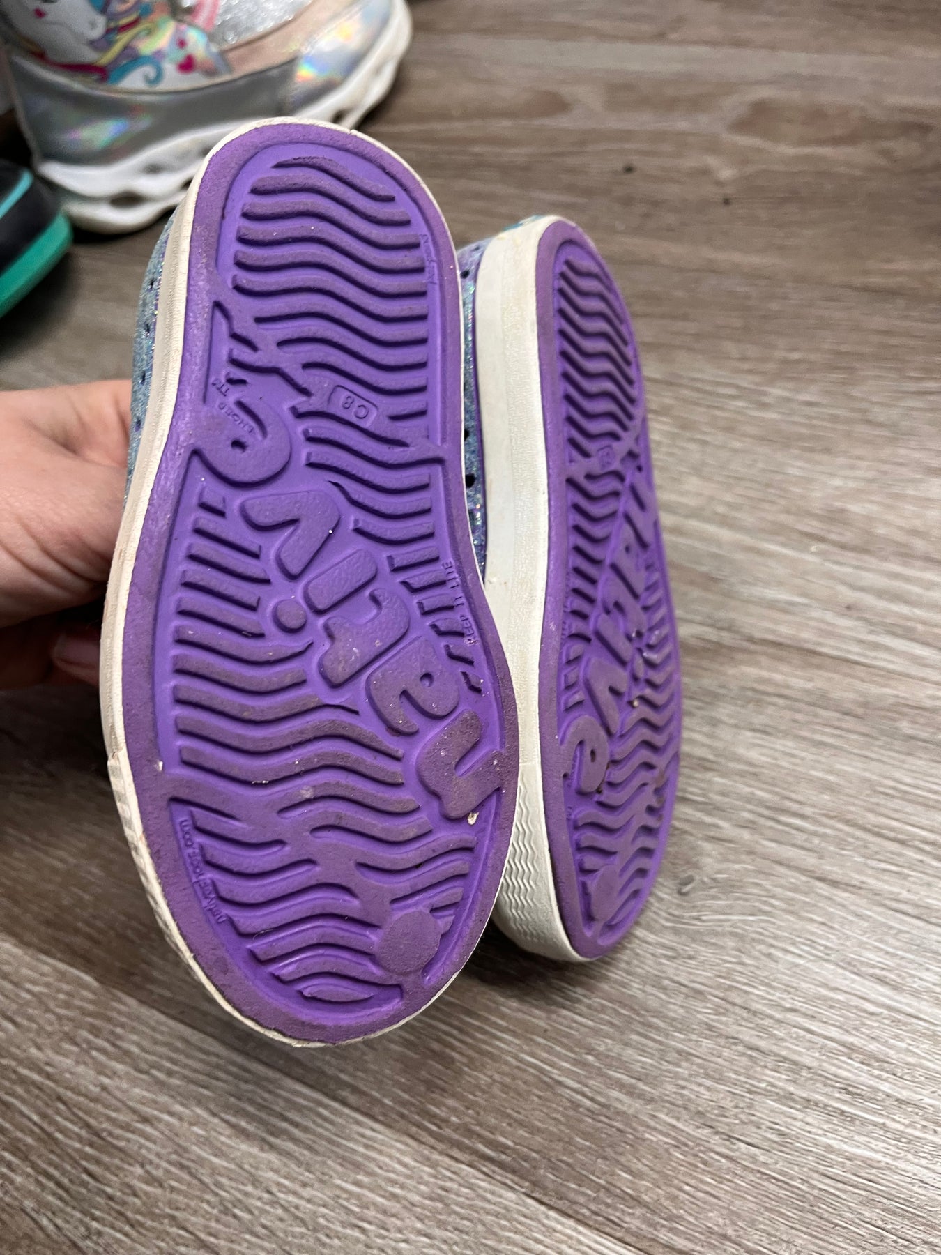 Native shoes in purple sparkle finish. Good used condition.