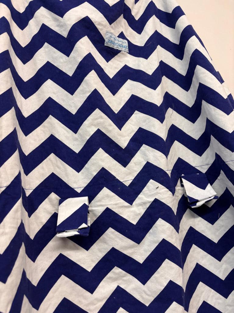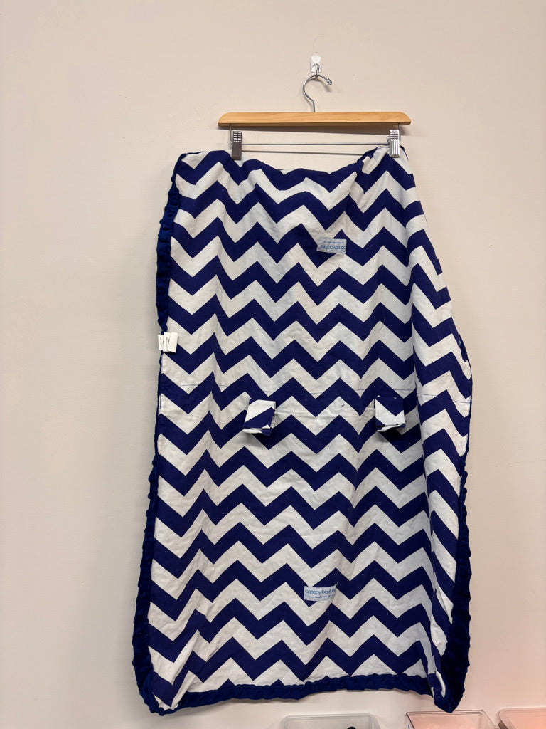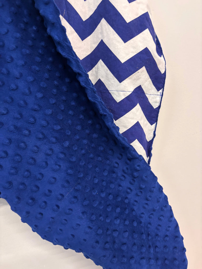 Royal blue minky inner; chevron stripe outer. Attaches to car seat handle.