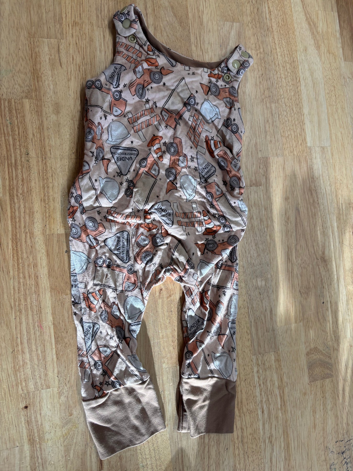 Pink construction/transportation scene romper with adjustable ties. Fair used condition.
