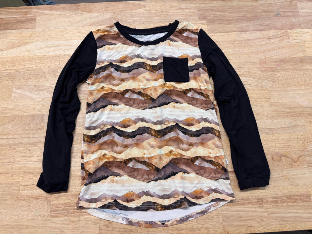 Ploom Baby size 7/8 year bamboo long-sleeve shirt in Sierra-brown with mountain-scene print. Good used condition.