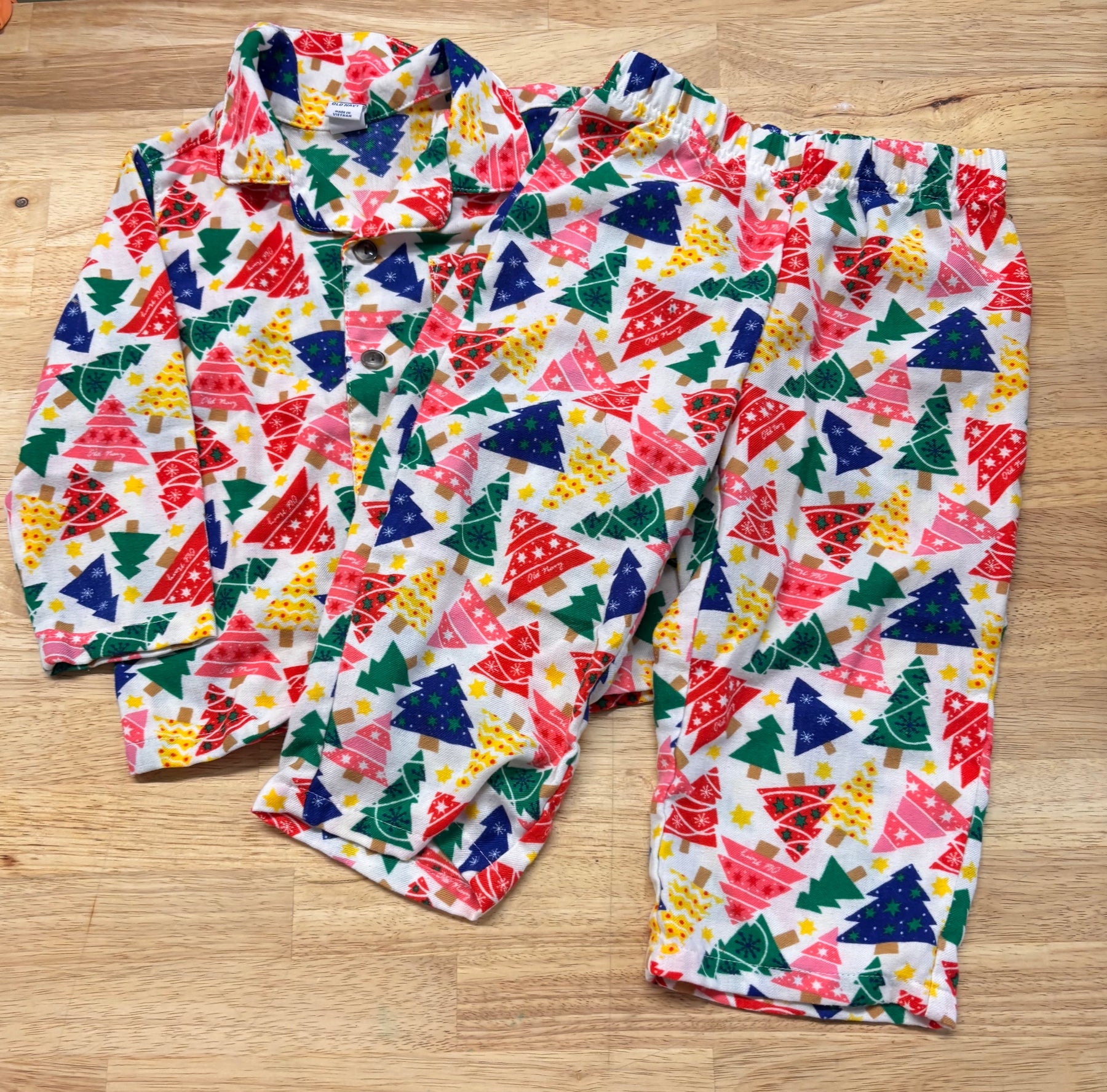 Old Navy size 18-24M two-piece holiday PJ set with colorful Christmas tree print. Lightweight muslin material. Good used condition.