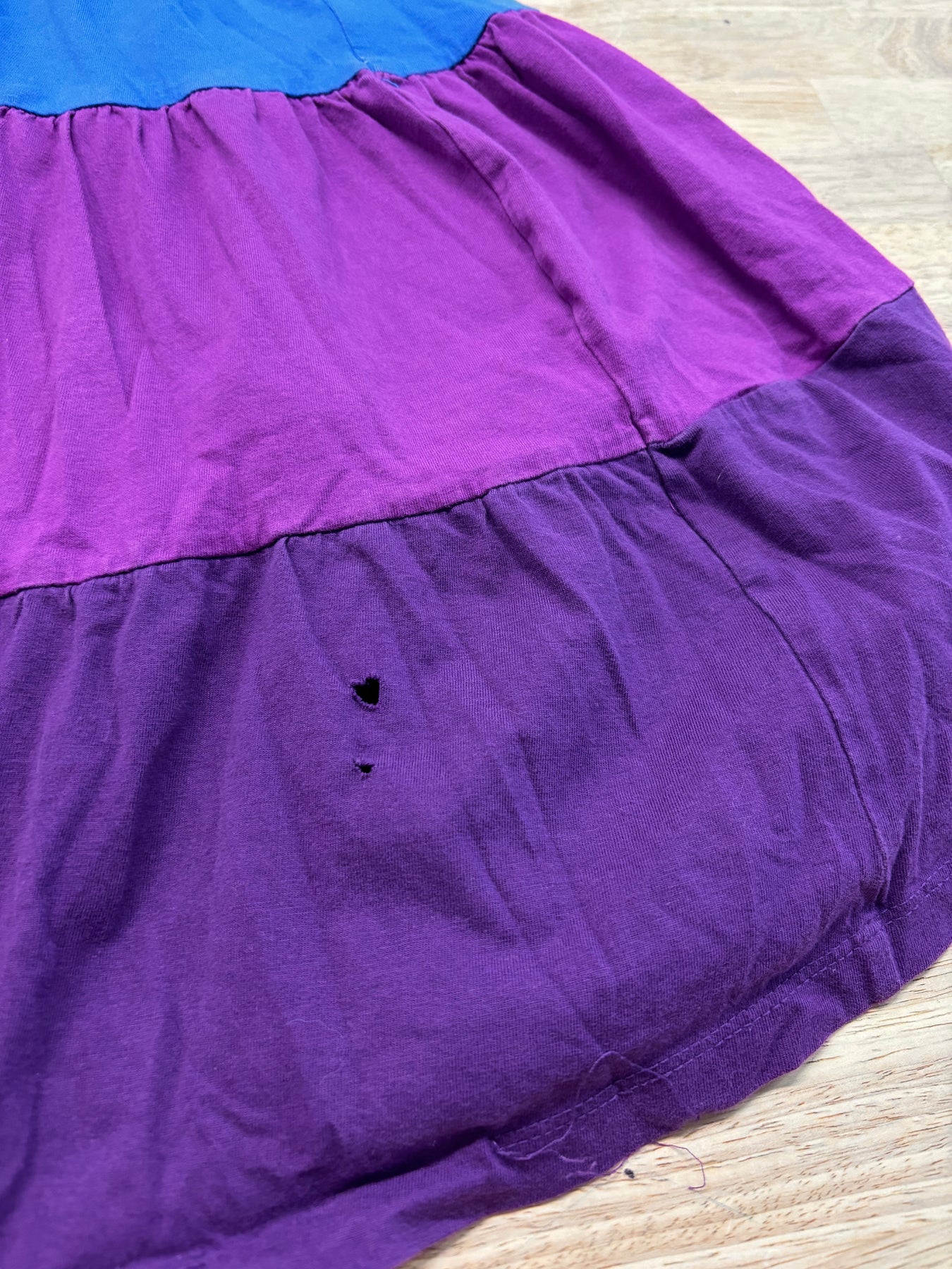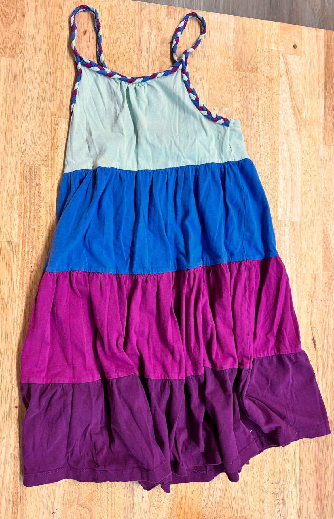 Colorblock spaghetti-strap summer dress. Size 10–12. Play condition with holes noted on back.