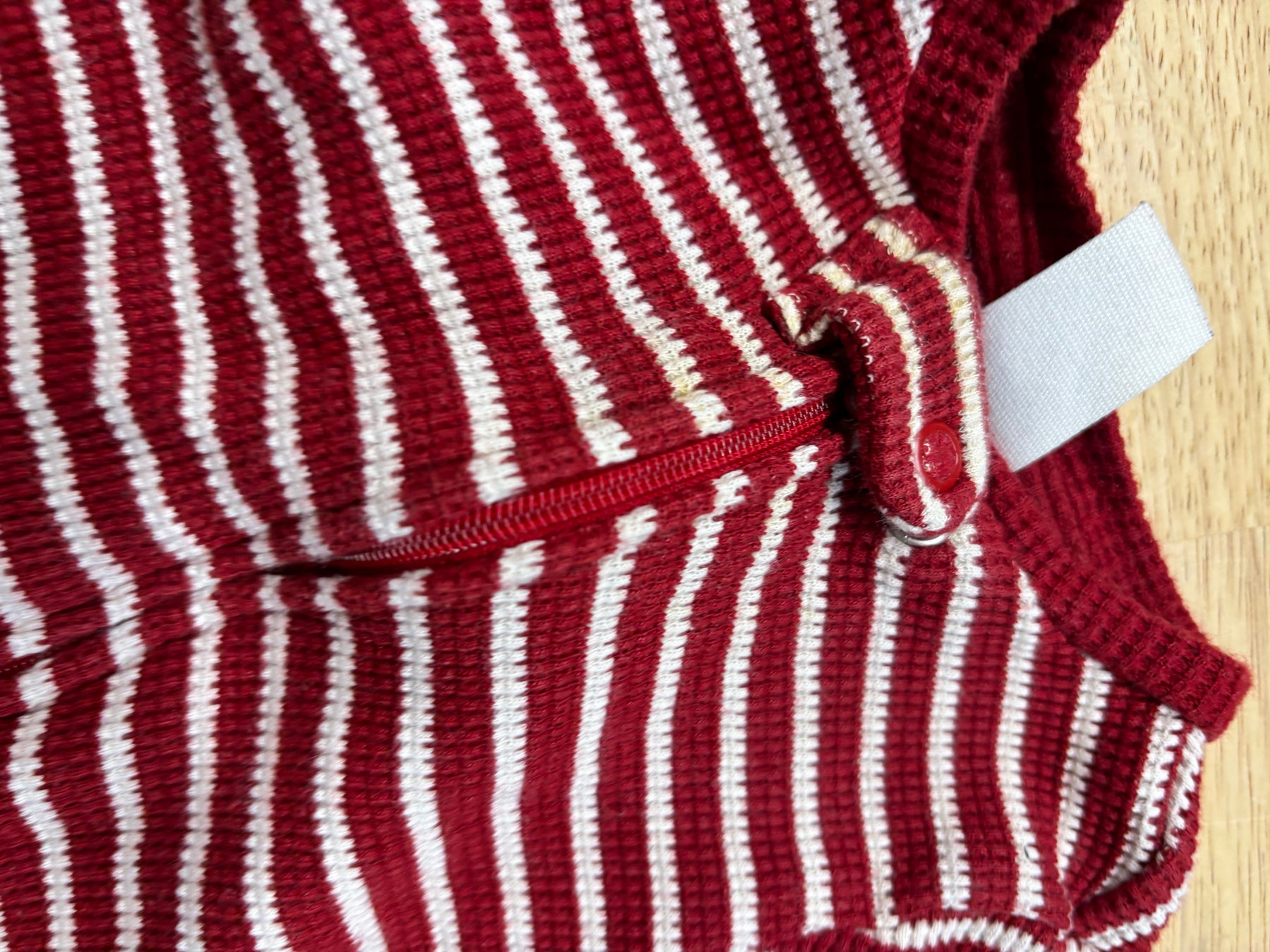 Ribbed footed sleeper with red and white stripes and yellow zipper cover. Good used condition.