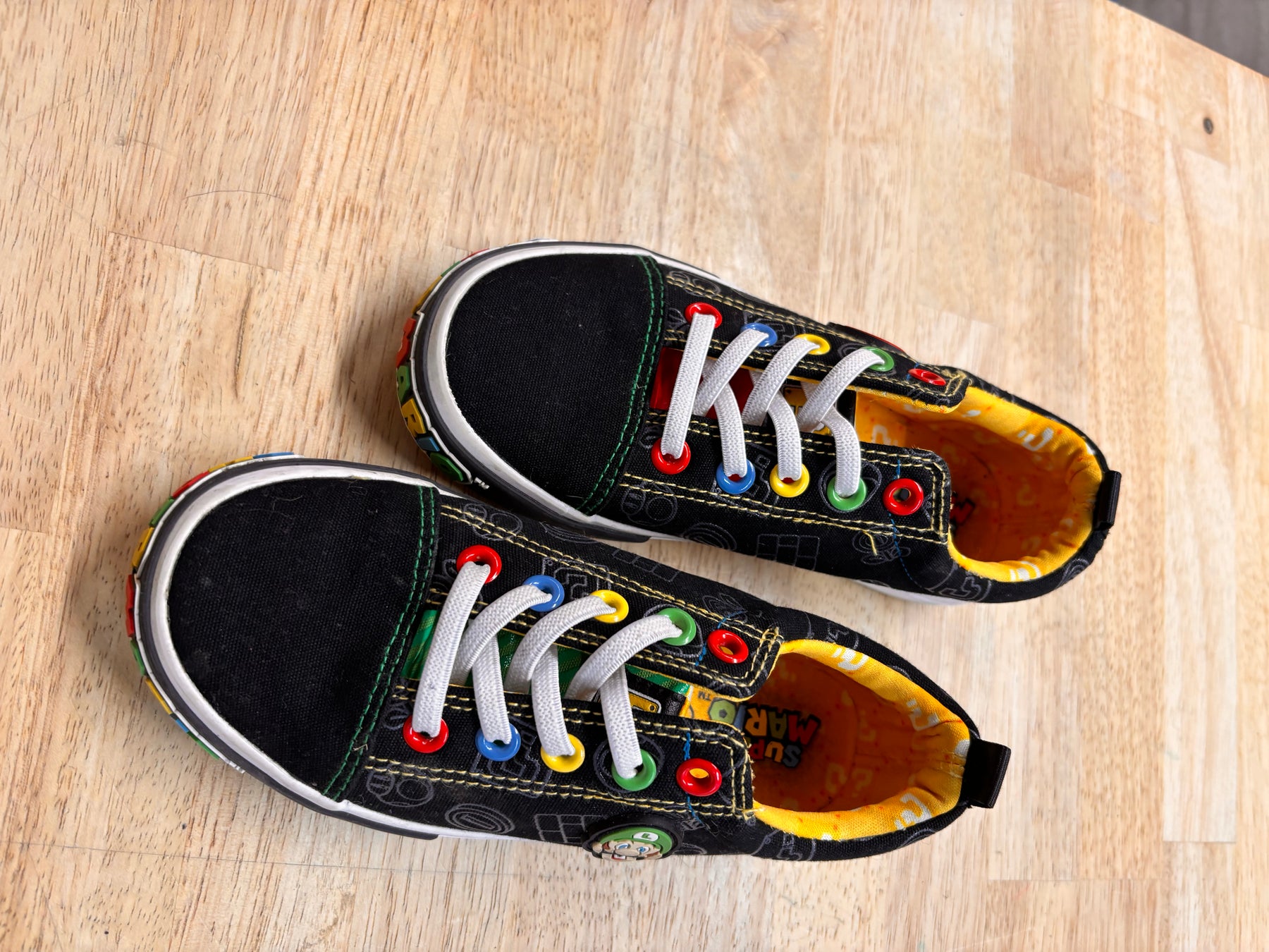 Black sneakers with Super Mario branding and elastic laces. Size 13. Great condition.