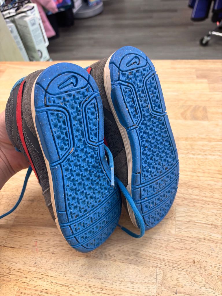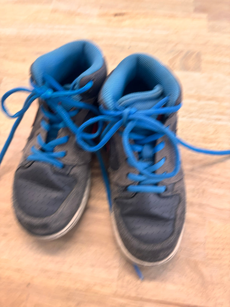 Black Nike high-top sneakers with blue interior. Size 13. Fair used condition with visible wear.