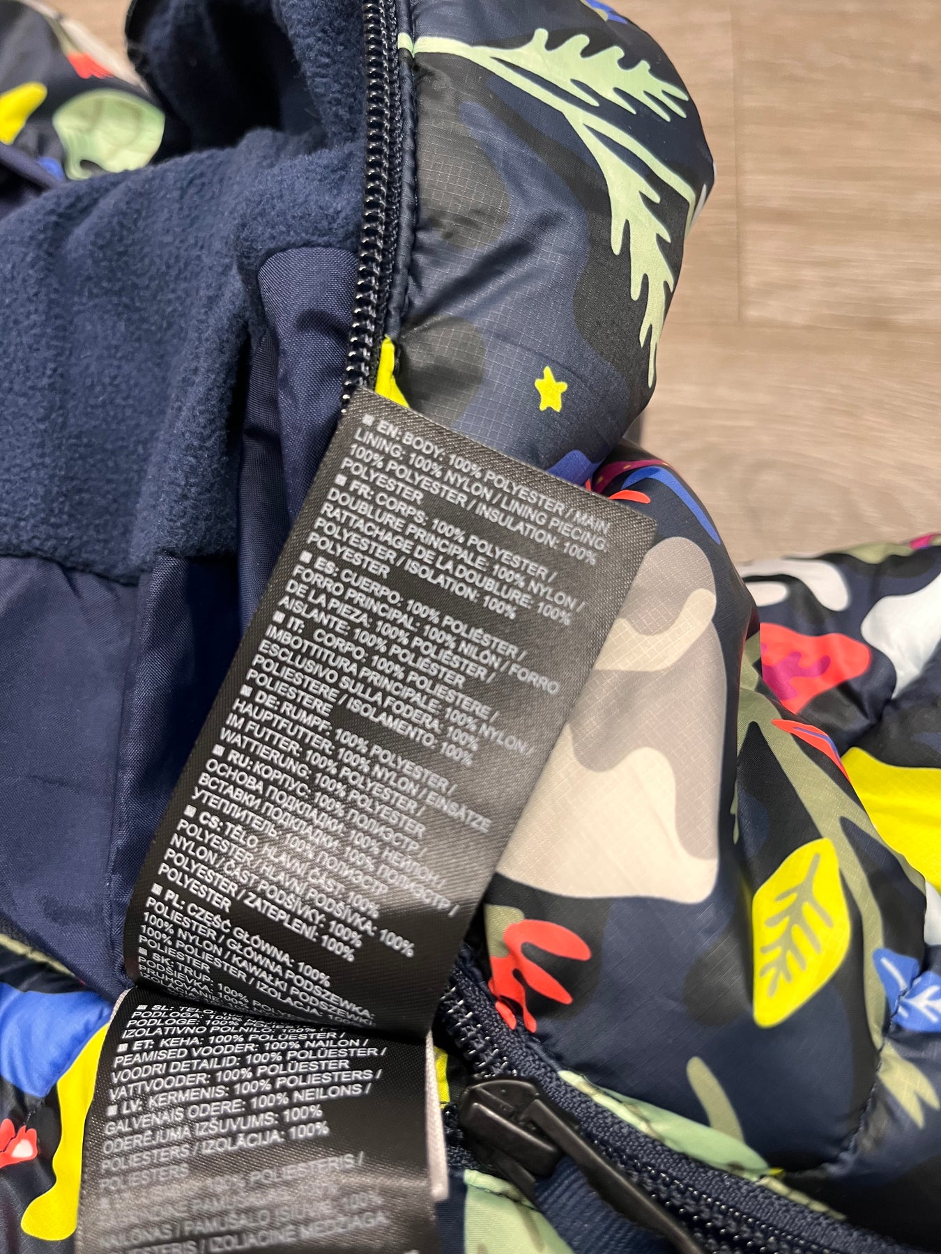 Forest print with neon accents featuring owls, turtles, and more; hooded; good used condition with 100% polyester fill.