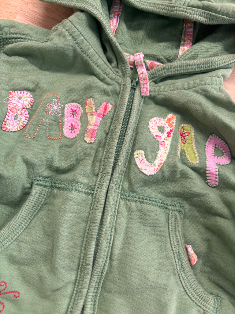 Green hoodie with floral graphic; size 3–6M; good used condition.
