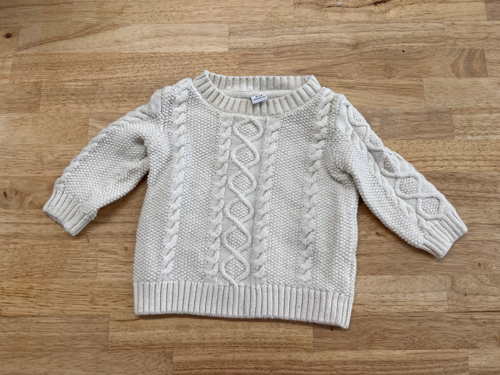 White cable knit sweater. Size 3–6 months. Good used condition.