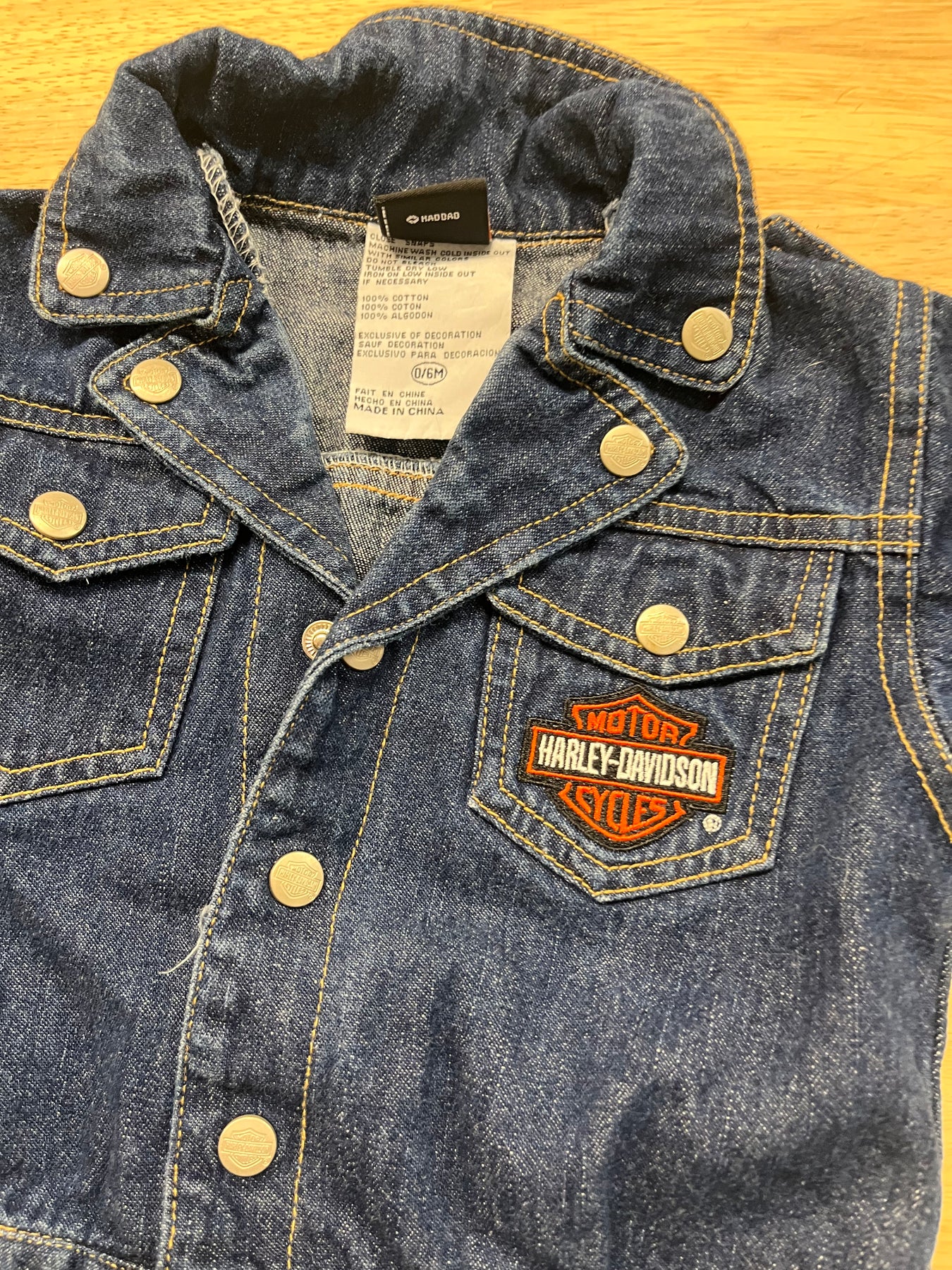 Harley Davidson dark denim jacket with snap front and cycle logo on pocket. Plain back. Size 0–6 months. Great condition.