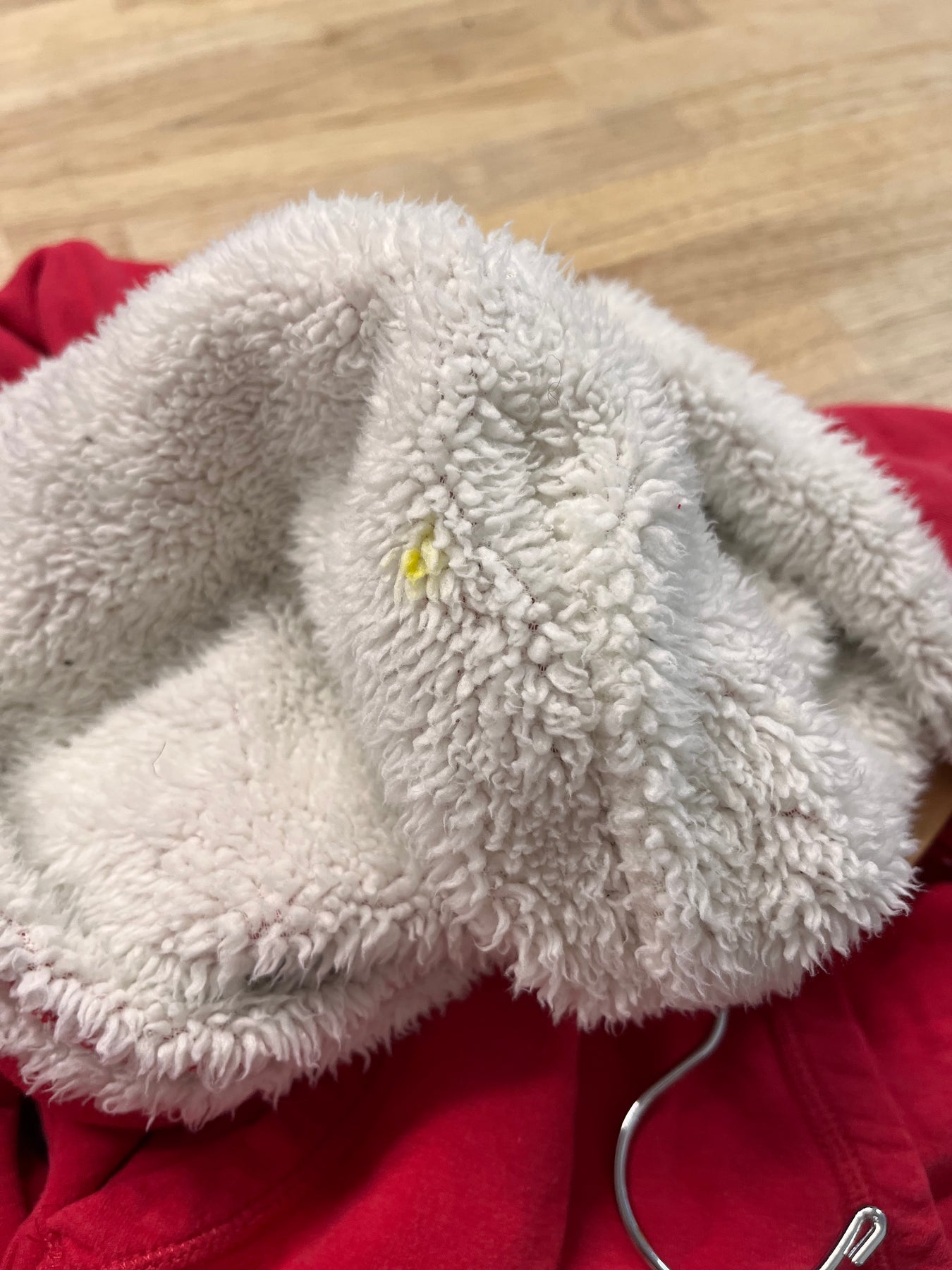 Zip-up bamboo hoodie in red with sherpa hood; light wash fade, yellow highlighter mark in hood; otherwise good used condition.