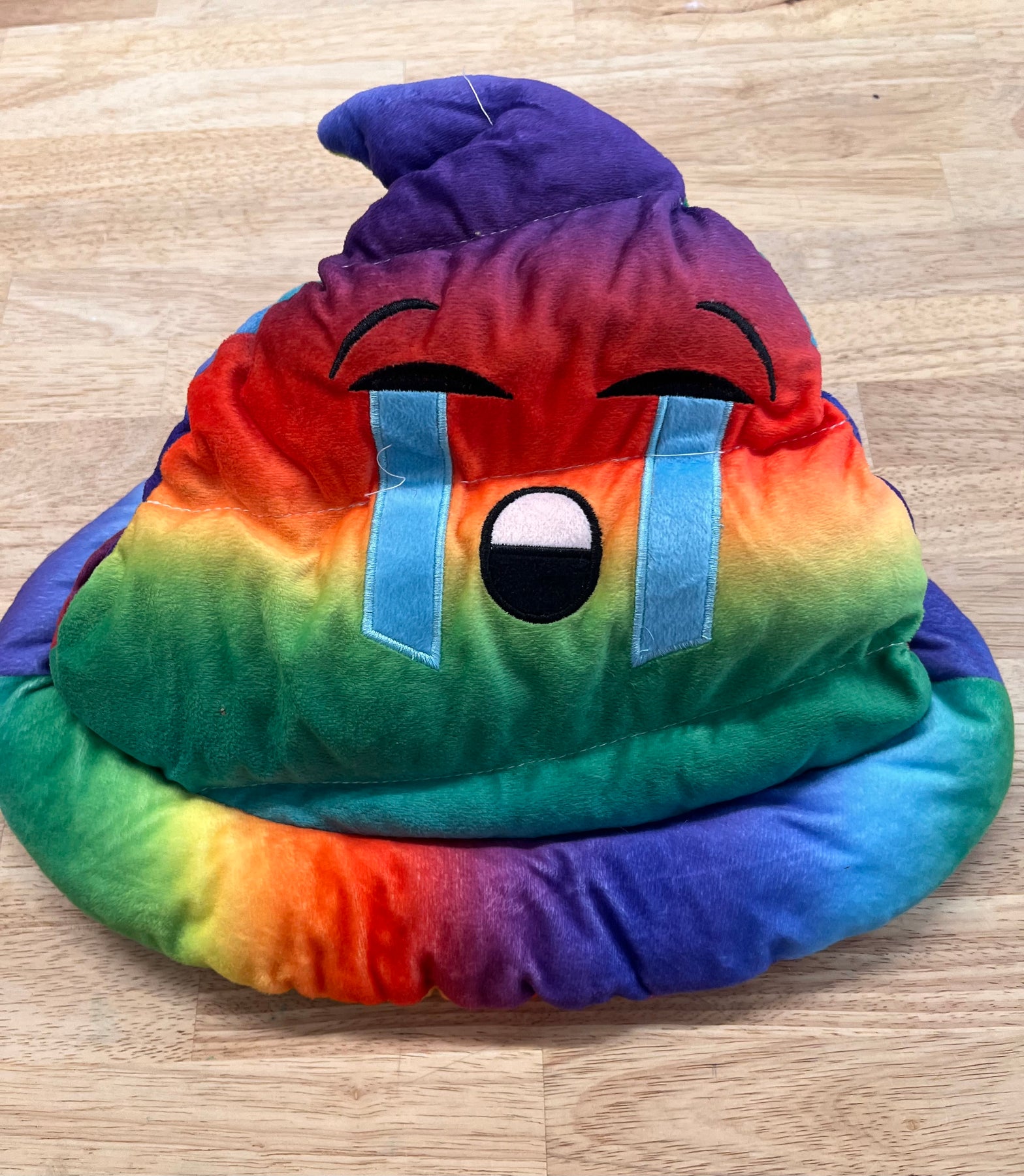 Kids' novelty hat featuring a rainbow crying eyes poop emoji design. Good used condition.