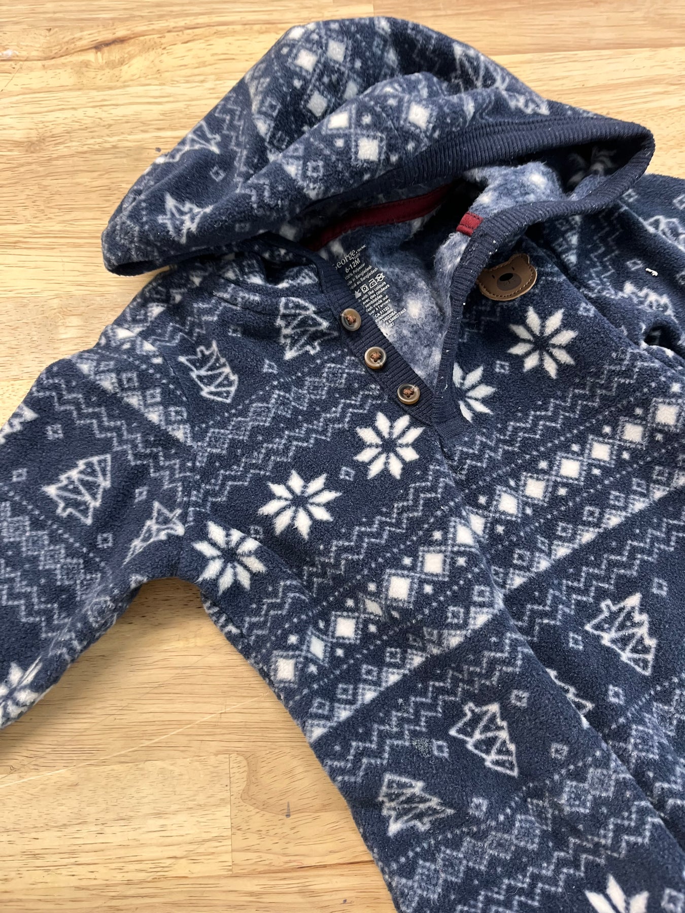 George lightweight fleece suit with hood, snap crotch, and button front. Navy with Christmas tree and poinsettia print. Good used condition.