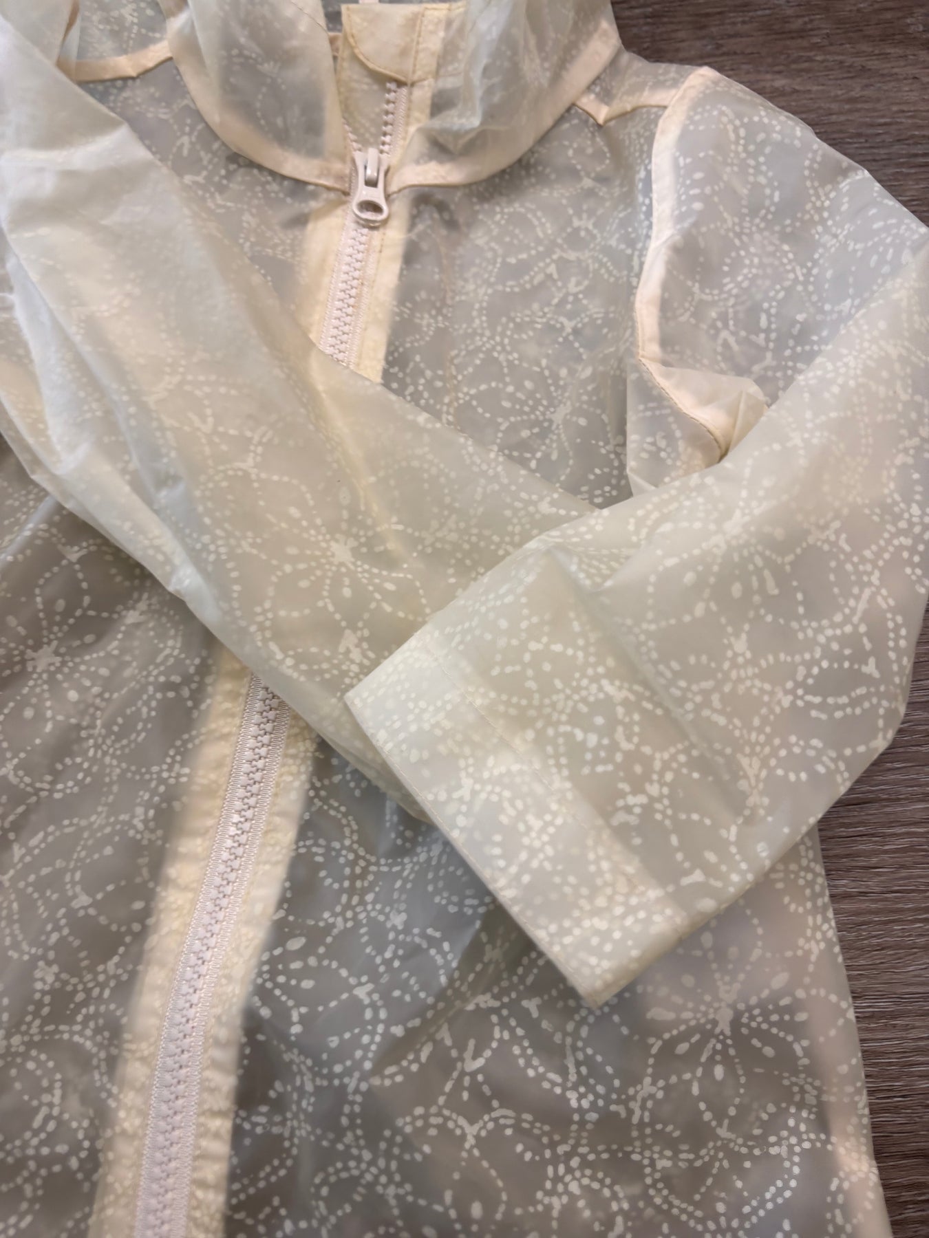 Clear see-through rain jacket with light yellow tinge and floral dot print. Good used condition.