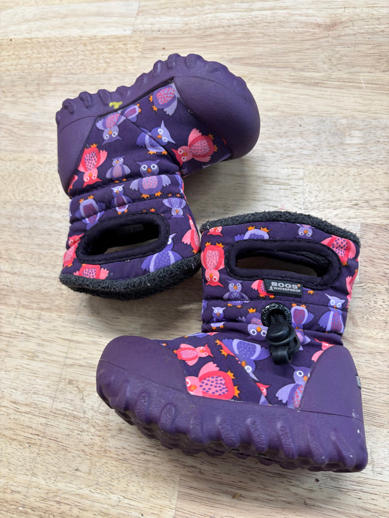 Size 4 Bogs Rebound winter boots in a purple owl print. Insulated pull-on style rated to approximately -20°C, designed to keep little feet warm during cold weather play.