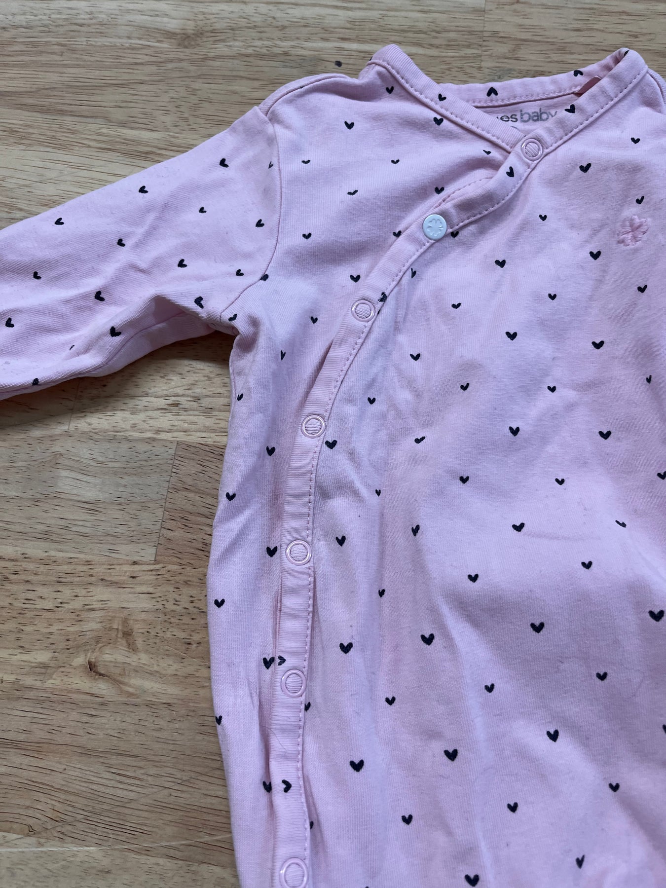 Noppies Baby pink snap romper with black heart print, snap crotch, and side snaps. Good used condition.