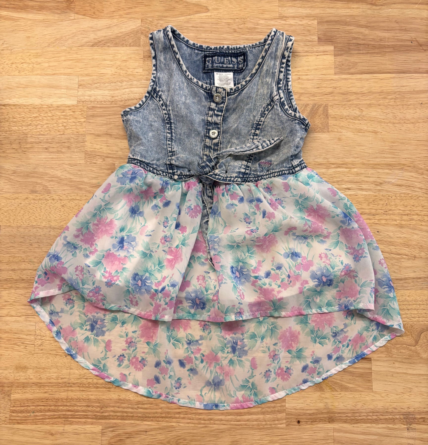 Guess size 2T dress with distressed denim bodice and light mesh skirt featuring pink/blue floral print. Light staining on bodice.