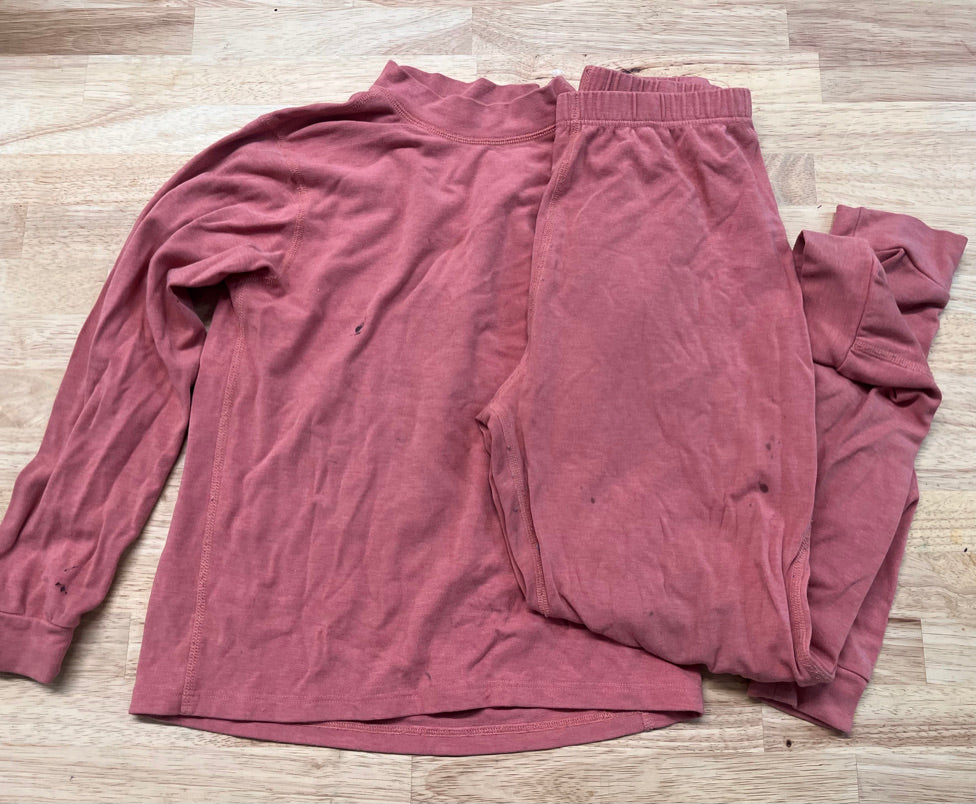 Nest Designs two-piece bamboo blend set in faded rose. Size 9–10 years. Play condition with staining and marks.