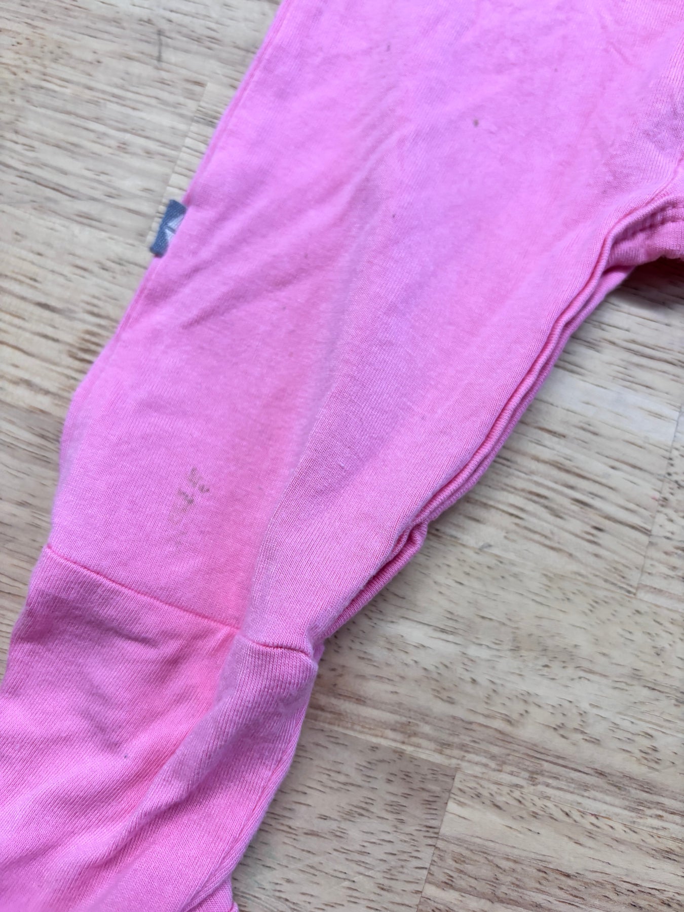 Pink bamboo romper with minor imperfections/staining; good used condition.