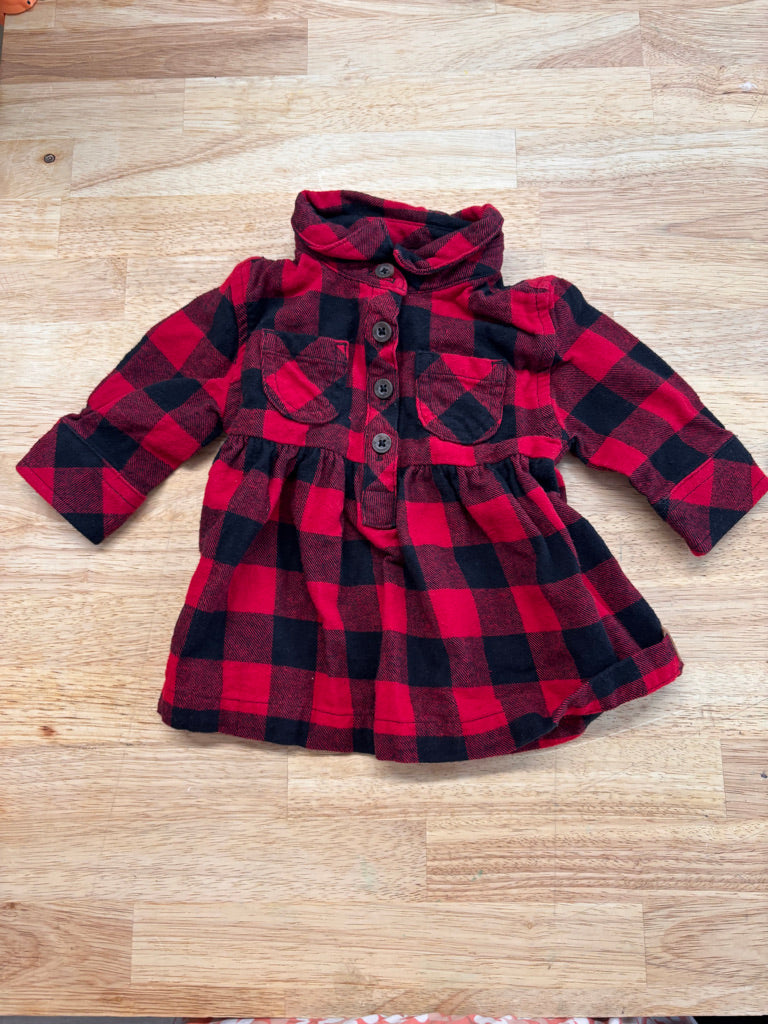 Collared button-up dress in red/black buffalo plaid. Size 0–3M. Good used condition.