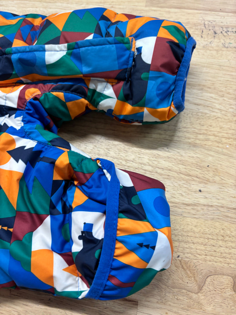 Down-filled one-piece snowsuit in blue/orange geometric print; great used condition. WEAR IN ON E SELEVE AS SHOWN, MAY BE STITCHED BACK TOGETHER BY TIME OF PURCHASE
