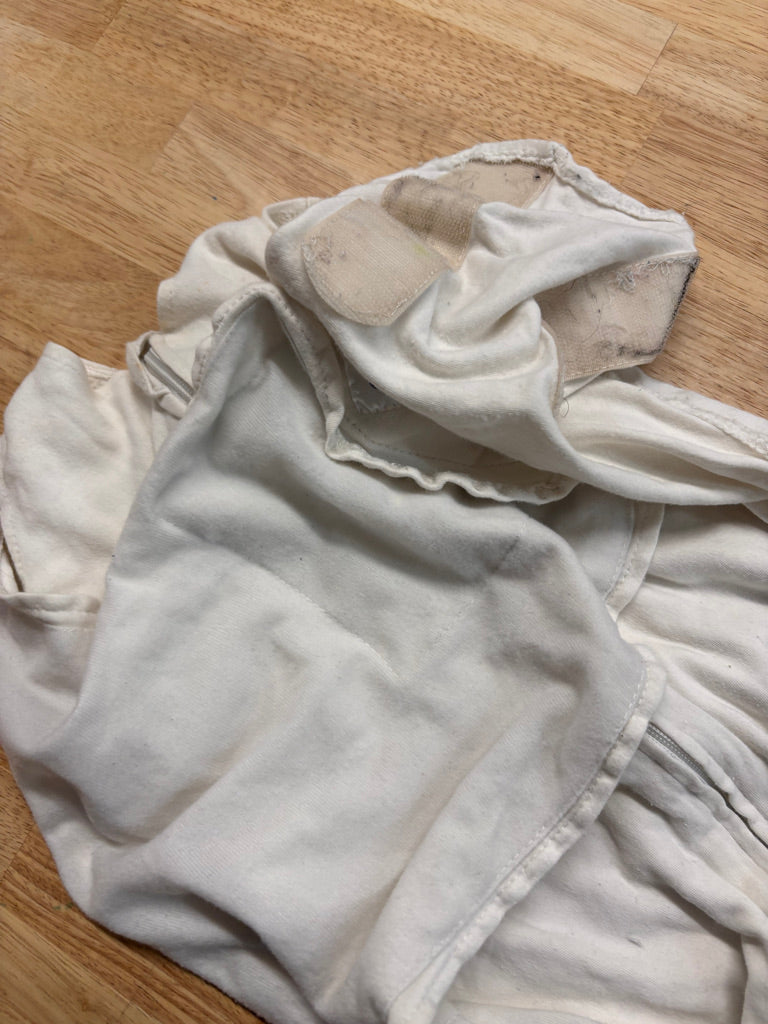 Cream newborn sleep bag swaddle. Good used condition. LIGHT STAINIGN ALONG NECKLINE