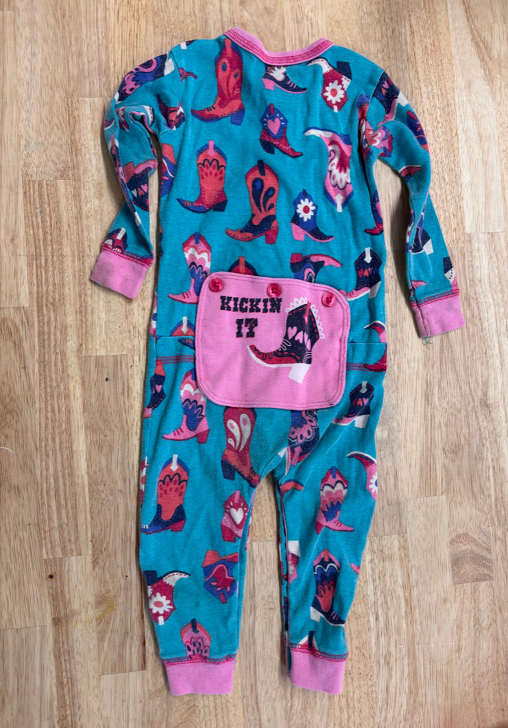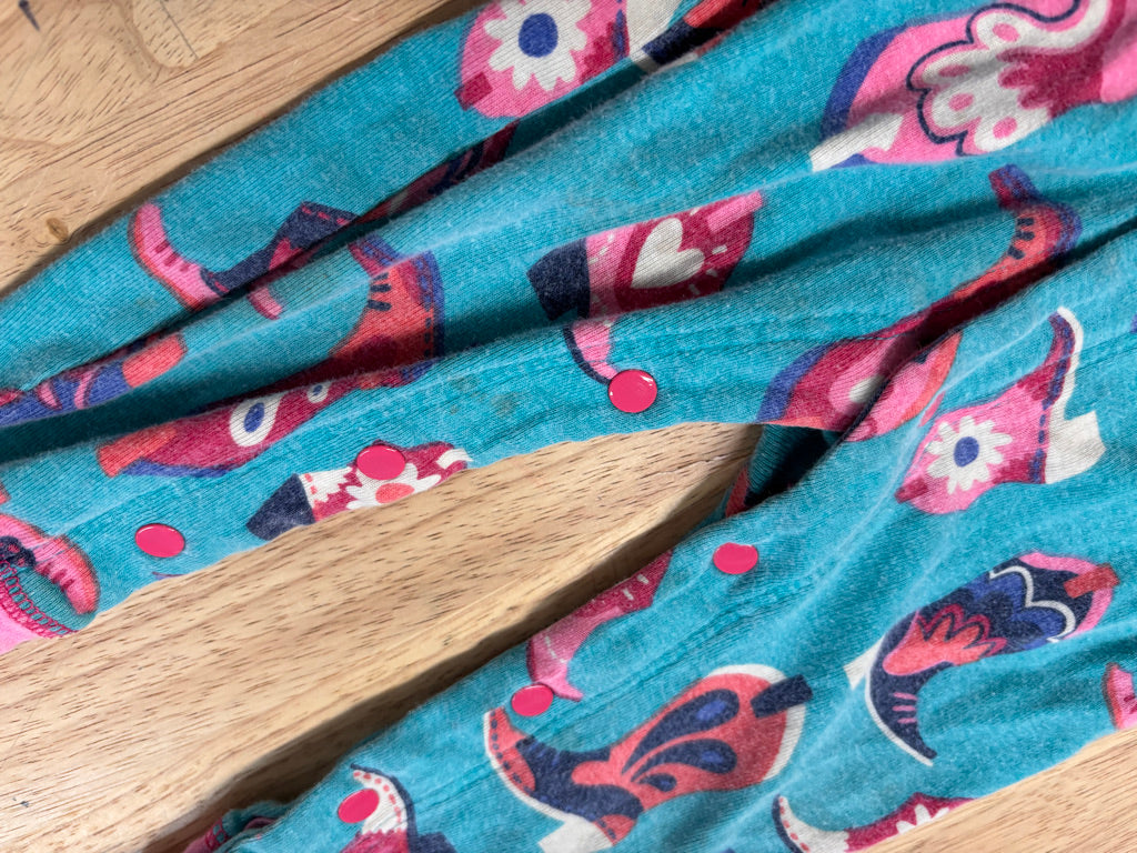 Fair condition with some overall wash wear and stains, cute western print and bum flap design.