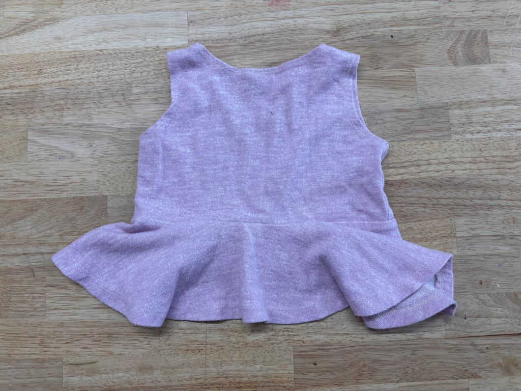 Handmade in Canada purple peplum top. Tag faded, size estimated 18–24 months. Good used condition.