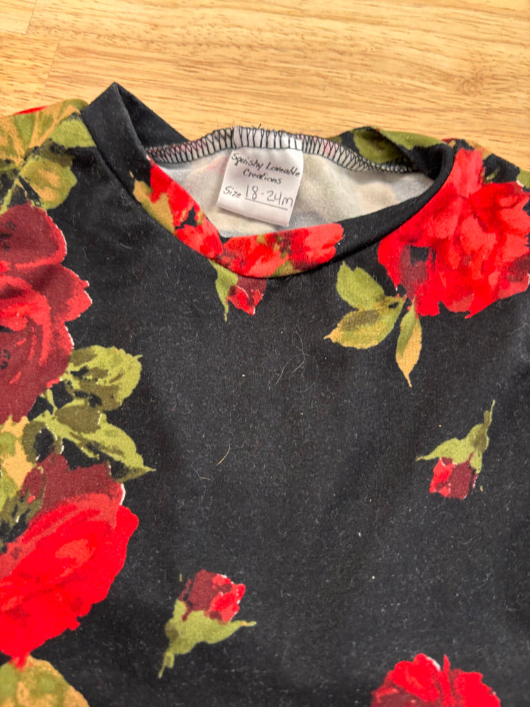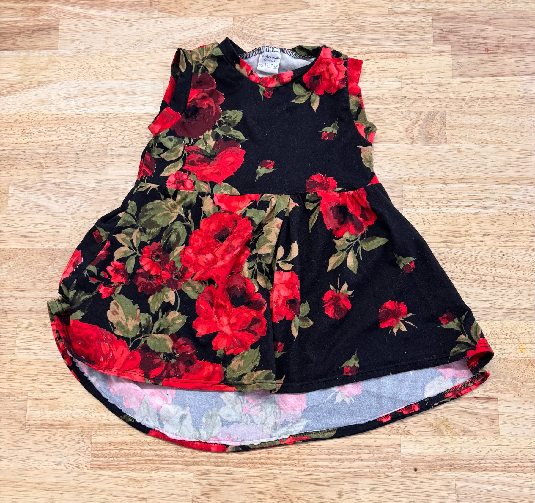 Handmade in Canada dress, black with red rose print. High-low cut hem. Good used condition.