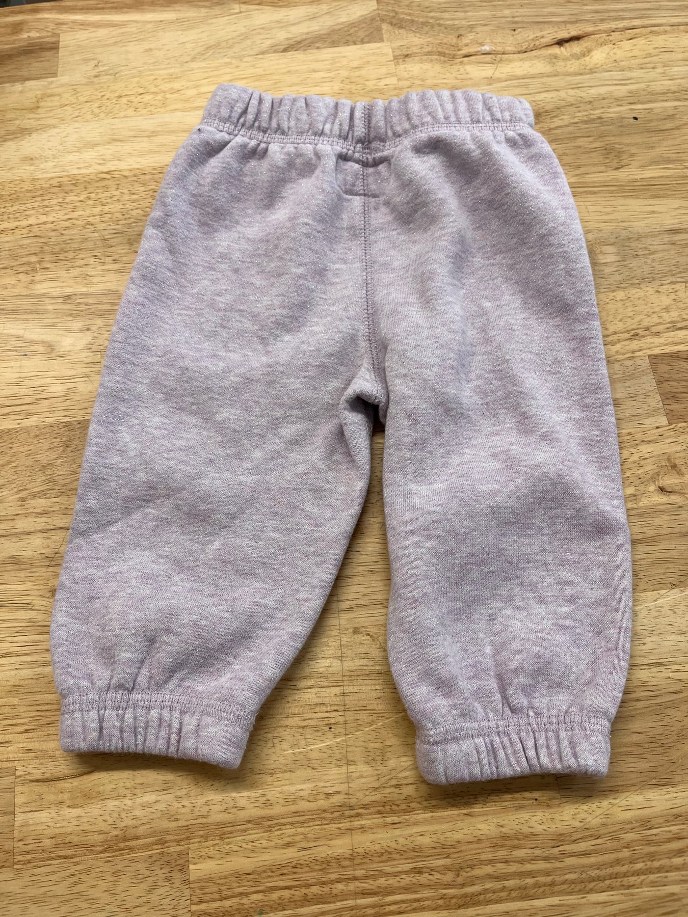 Light purple sweatpants with silver sparkle; fair condition for staining, otherwise minimal wash wear.