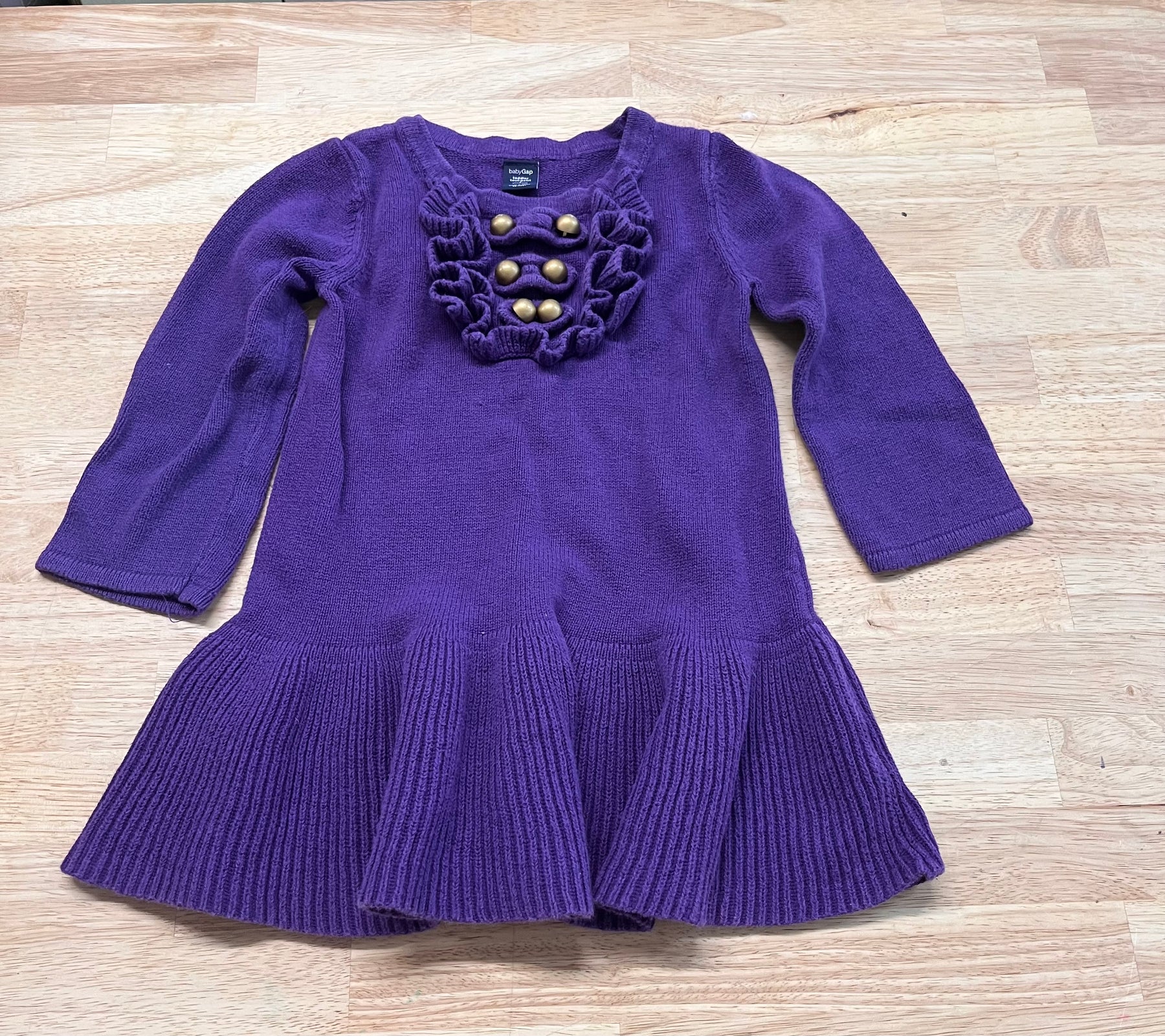 Drop waist purple sweater dress with front ruffle detail. Good used condition.