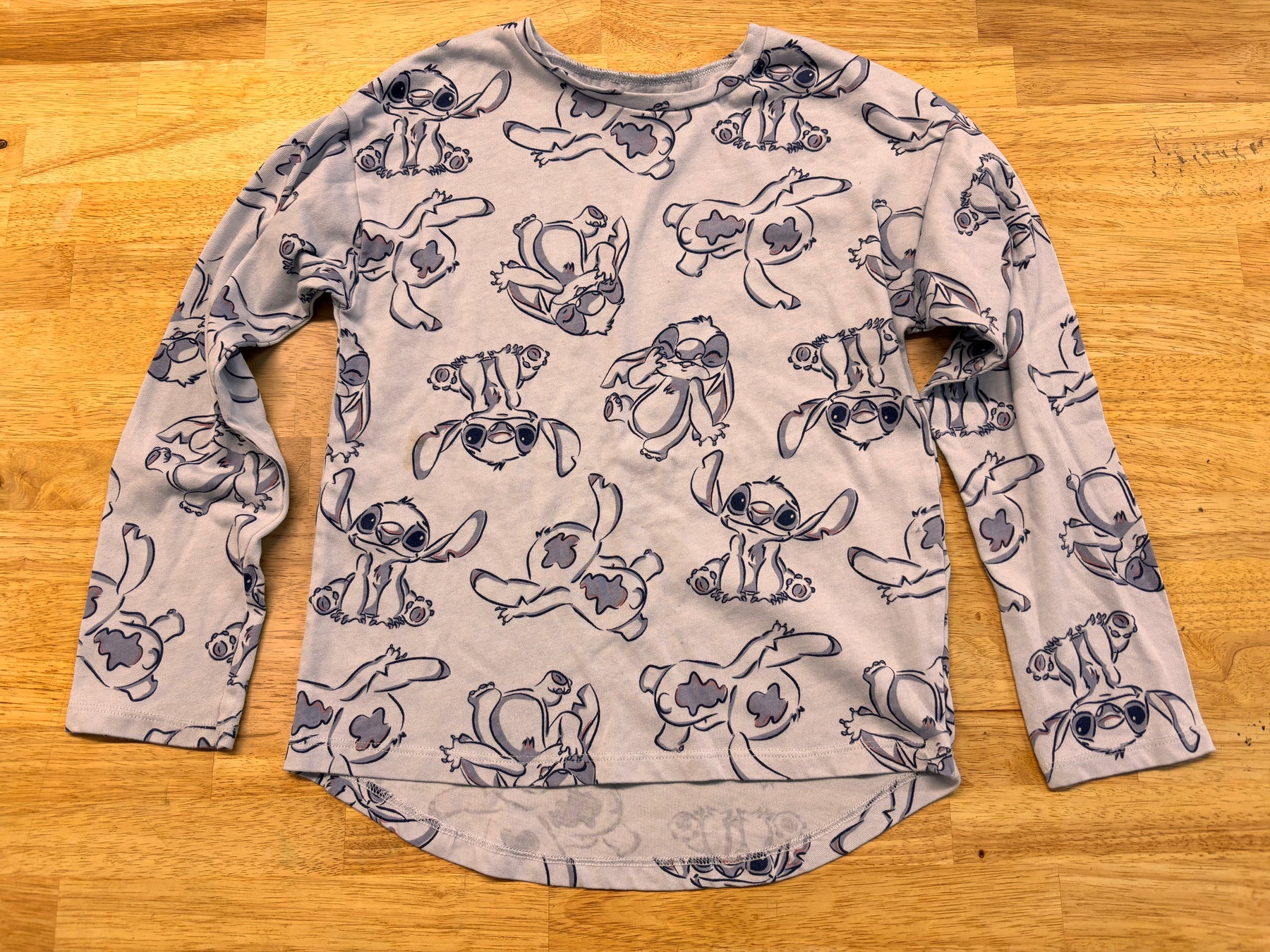 Blue long sleeve shirt with Stitch all-over graphic print. Size 8. Good used condition.