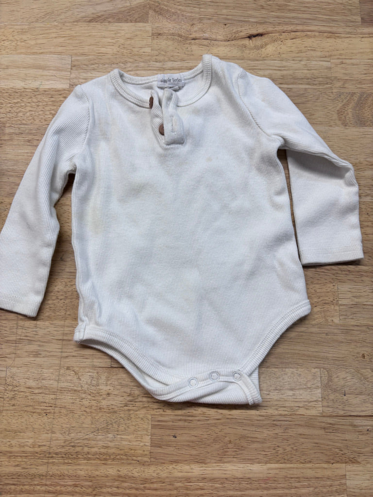Long-sleeve ribbed white bodysuit. Light yellowing and staining along neckline from wear. Fair used condition.