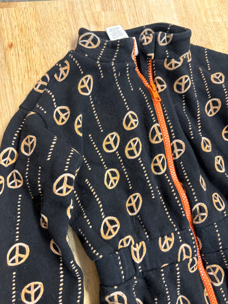 Nordstrom by Christina Martinez cotton one-piece romper in black with peace signs, orange zipper, 100% cotton. Size 4. Good used condition.