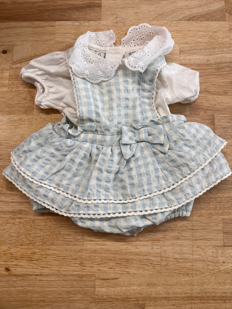 Blue gingham jumper bodysuit with coordinating collared shirt; scalloped lace neckline; size 3–6M; good used condition.