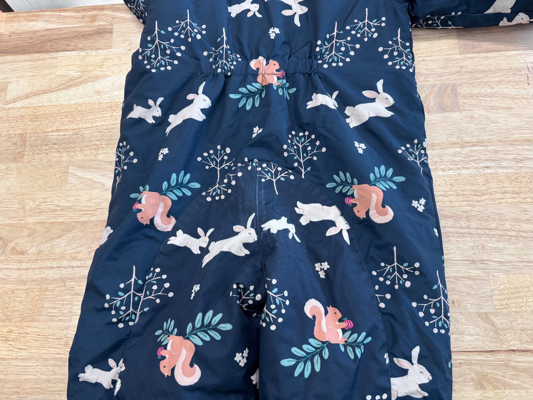 H&M snowsuit with bunny print; faux-fur hood; moderate wear throughout but no holes noted.