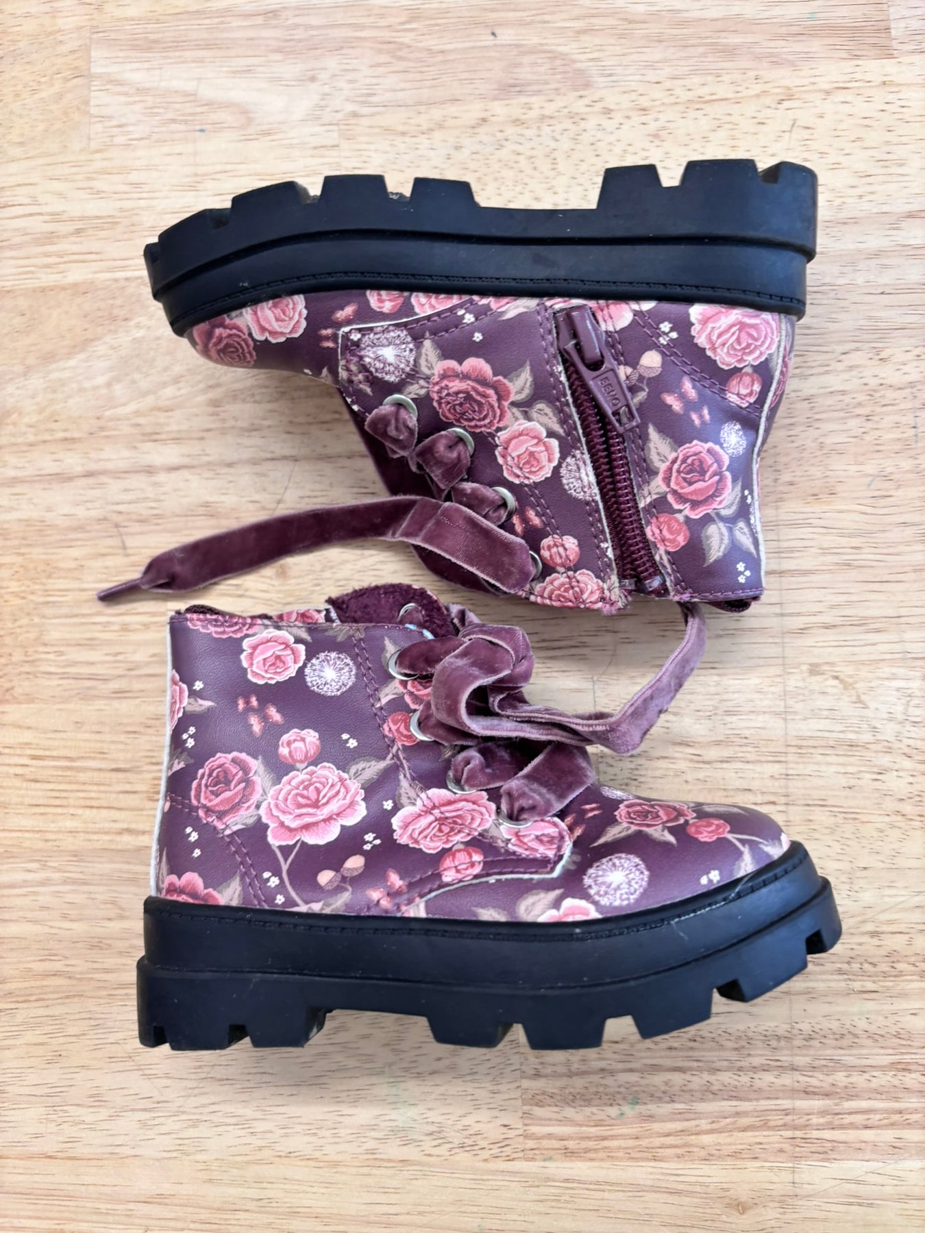 H&M burgundy ankle shoes with velour laces + side zipper; great condition, minimal wear.