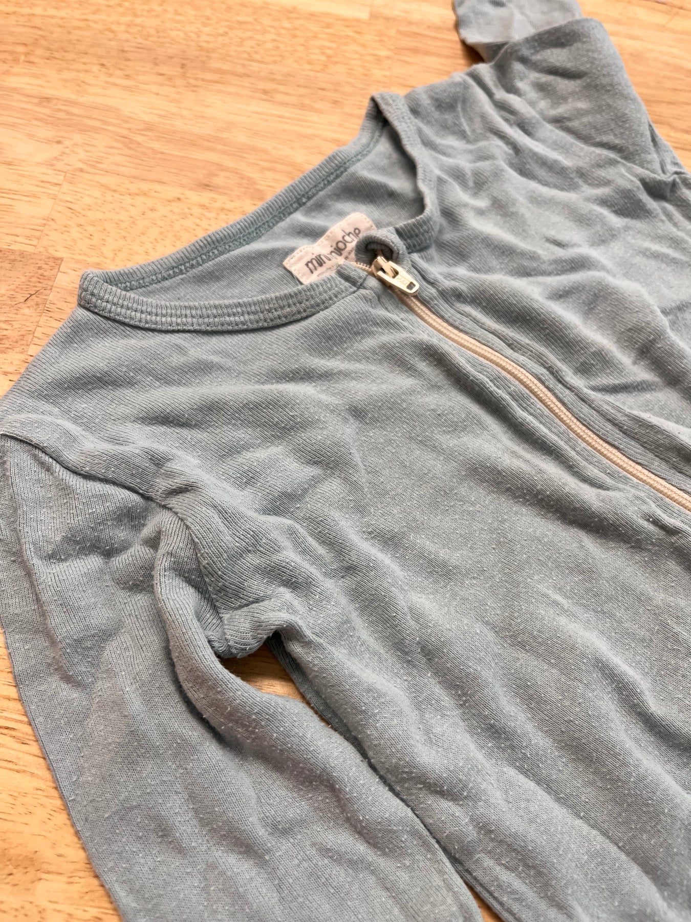 Light blue romper with heavy pilling and stretched neckline; fair condition.