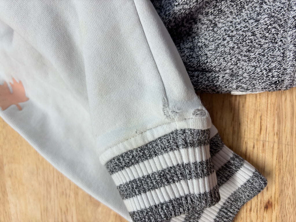Heathered grey varsity-style sweater jacket with Roots text on the back. Play condition with wear at cuffs; otherwise fair and wearable.