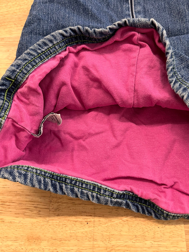 Denim lined dress with pink and purple floral waist detail; light wear and fade; size 2T.