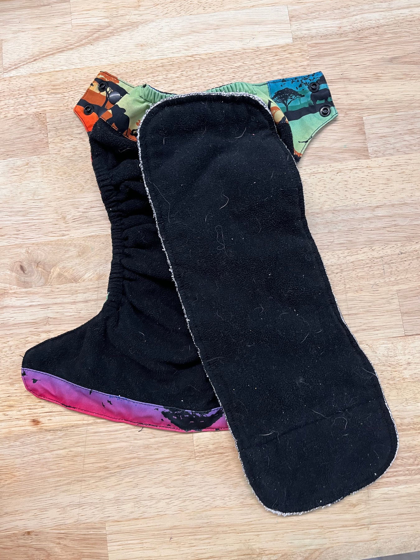 Nicki’s Diapers All-in-Two with microfiber insert. Safari print. Fair used condition.