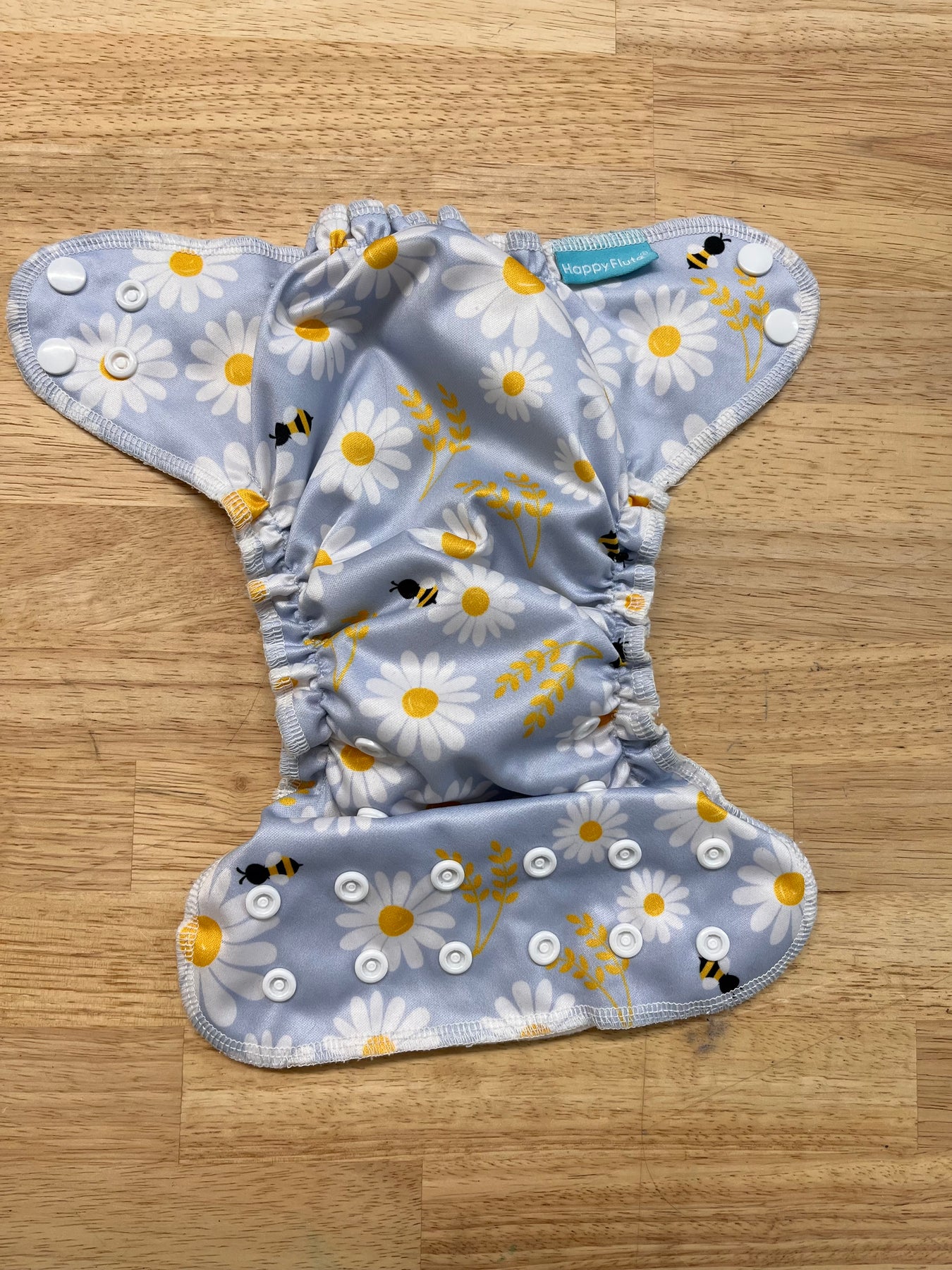 wborn All-in-One diaper with cotton inner, serged edging, and daisy bee print. No opening (complete style). Good used condition.