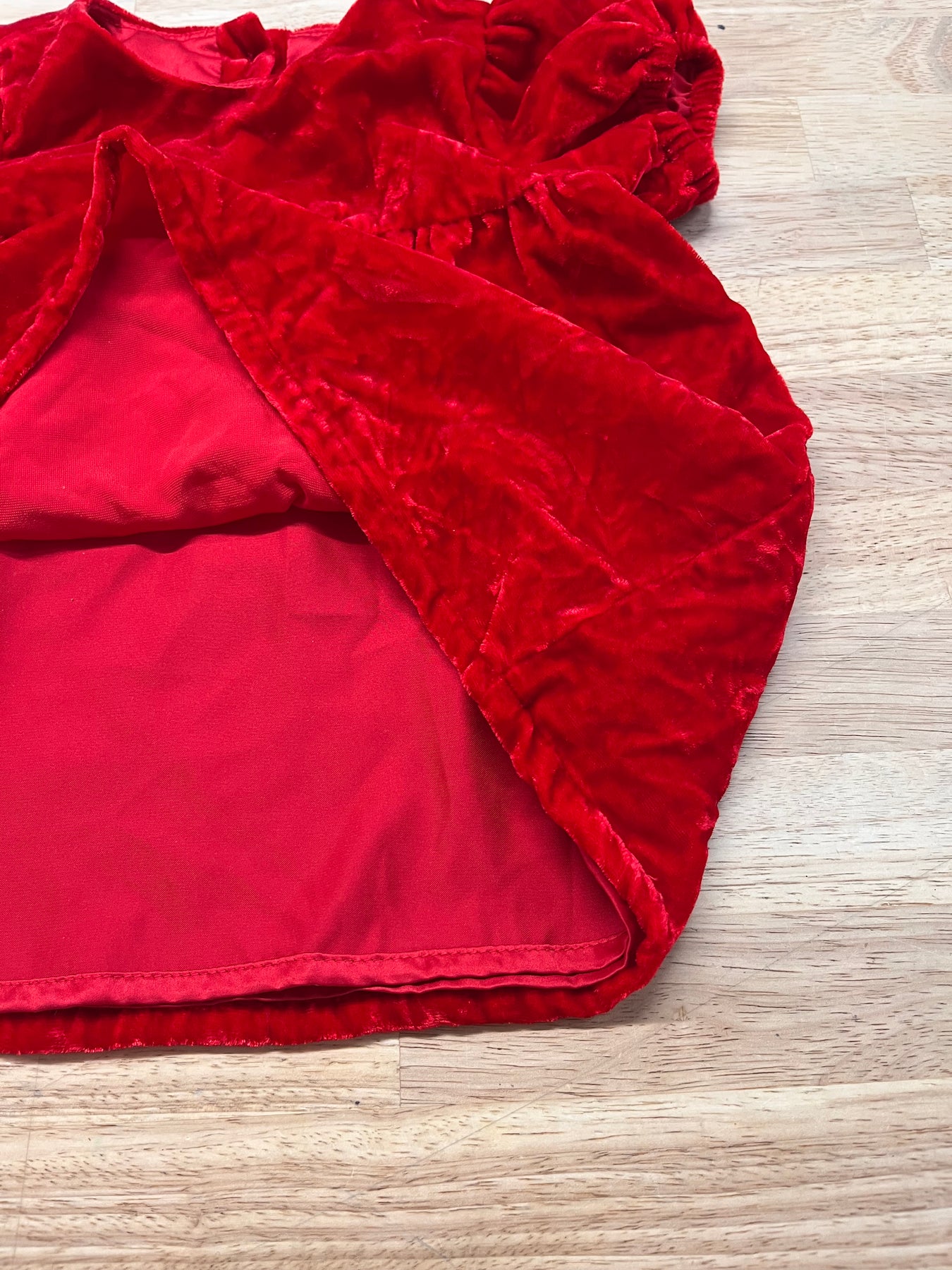 Hatley holiday dress in size 3–6 months; bright red crushed velvet look with underskirt for fullness; good used condition.
